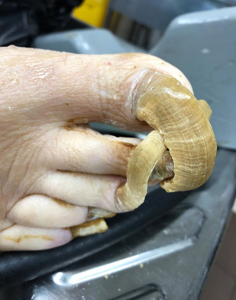 An extreme example of onychogryphosis, the distortion of finger or toenails due to chronic irritation and inflammation coupled with infection!! Onychogryposis is a nail dystrophy resulting in thickening and increase in curvature or curling of the nail, resembling claws. An affected nail may have many grooves and ridges, is usually brownish in color, and grows more quickly on one side than on the other, involving the great toe more commonly. It is the result of injury to the matrix, sometimes coupled with a long term fungal infection, which causes the nail to grow more thickly. It may be partially hereditary and is also caused by trauma or peripheral vascular disease, but most often secondary to self-neglect and failure to cut the nails for extended periods of time, seen in elderly. The thick curved nail is difficult to cut, and often remains untrimmed, exacerbating the problem. Treatment consists of avulsion of the nail plate with surgical destruction of the nail matrix with phenol or the carbon dioxide laser, if blood supply is adequate.