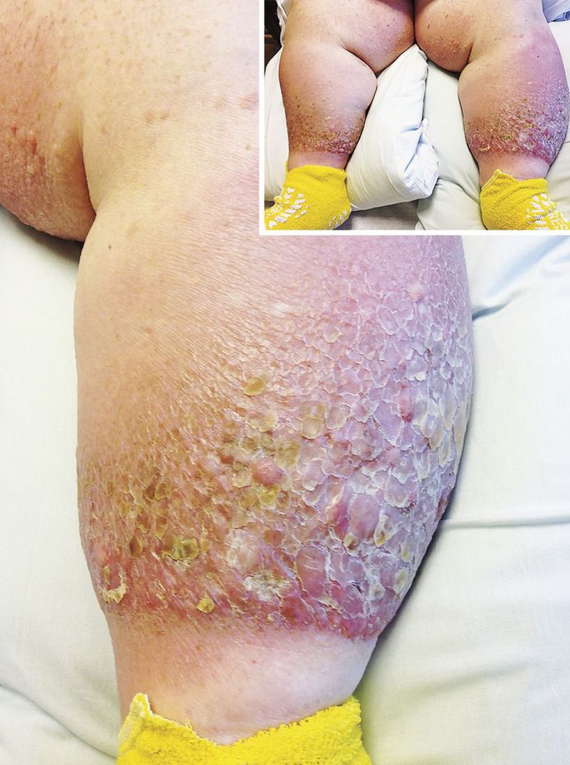 A 49-year-old woman with morbid obesity and hypertension presented with extensive areas of redness and weeping sores on her legs. She had an 8-year history of chronic venous stasis and lymphedema. The physical examination of the lower extremities showed chronic changes of dependent edema with hyperkeratosis, papillomatous plaques, and loosely adherent crust and cobblestone-like nodules that extended to the thigh (inset), along with more acute changes that included erythema up to the knee with a weeping superficial ulcer on the anterior aspect of the left leg below the calf. Venous Doppler studies of the legs and feet revealed no evidence of deep-vein thrombosis. These changes that occur as a result of chronic venous stasis are known as elephantiasis nostras verrucosa. There is often no history of filariasis, but patients often have lymphangitis, cellulitis, scleroderma, and obesity. She was treated with wound care and a brief course of antimicrobial therapy. The erythema and warmth improved after 2 days.