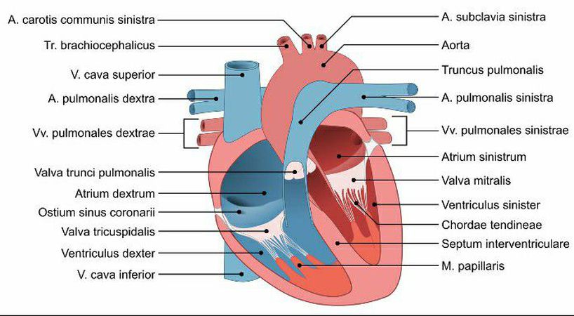 Blood with more CO2 enter the heart through Vv. Cava inferior & superior into the right atrium passing tricuspid valve going into the right chamber then passing pulmonary valve going into truncus pulmonalis & the pulmonary arteries to the lungs (pulmonary circuit). Here we the exchange of CO2 and O2. The blood with fresh O2 goes now through the pulmonary veins into the left atrium, mitral valve, into left chamber aorta valve, into the Aorta through the whole body and back to the right atrium (systemic circuit)