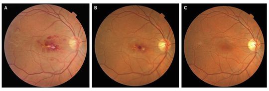A 34-year-old man presented to the eye emergency department with reduced vision in the right eye that had developed that morning. He was well, apart from episodes of dizziness and dyspnea after exercise during the previous 4 months. These episodes had started 1 week after the patient had undergone a dental treatment. Previous extensive investigations had been inconclusive. His retinal appearance and symptoms prompted referral to the cardiology team, which admitted him that day. He was afebrile but had a pansystolic murmur and a solitary splinter hemorrhage on the right thumb. Echocardiography revealed moderate-to-severe mitral-valve regurgitation, with thickening and signs of vegetations. The ejection fraction was 65%. The other values were normal. Four sets of blood cultures yielded Streptococcus viridans, and intravenous antibiotics were started immediately. His symptoms improved, and his visual acuity gradually improved from 20/200 at presentation to 20/20 8 months after presentation. His right fundal appearance is shown, at presentation (Panel A), 3 days later (Panel B), and 3 months later (Panel C). The presence of white-centered hemorrhages (Roth spots) should prompt the consideration of possible infective endocarditis. A comparison of Panel A and Panel B (3 days apart) shows how quickly such spots can change. Monitoring of the patient's mitral-valve regurgitation, which was started after complete resolution of the endocarditis, is ongoing.