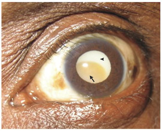 A 48-year-old man presented with gradual, painless diminution of the vision in his left eye over a period of 4 to 5 years. In this eye, the best corrected visual acuity was limited to perception of hand movements close to his face; the intraocular pressure was 14 mm Hg, with a clear cornea and a morgagnian cataract. A dense yellow-brown nucleus (arrow) had sunk inferiorly with a clear, milky-white cortex (arrowhead) above, leading to vision loss. Three weeks after the cataract was removed, the patient was given eyeglasses (−1.5 diopters at 90 degrees). At the last follow-up visit 1 year after surgery, his best corrected visual acuity was 20/30 in the right eye and 20/20 in the left eye. Morgagnian cataract is a form of hypermature corticonuclear cataract. The normal aging process of dissolution occurs more rapidly, leading to enzymatic degradation of cells and precipitation of crystalline protein that causes liquefaction of the lens fibers and resorption of the cortical fluid. This condition should be managed promptly because rupture into the anterior chamber can cause an inflammatory reaction or phacoanaphylactic uveitis. It may also be complicated by phacolytic glaucoma or dislocation posteriorly into the vitreous cavity.