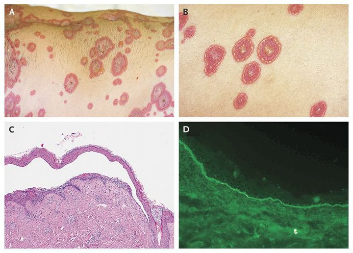 An otherwise healthy 47-year-old man was admitted for an extensive bullous eruption that had developed over the previous 10 days. He was not receiving medication when the bullae began to appear, and his condition deteriorated rapidly. Erythematous patches covered almost the entire body surface. Numerous tense vesicles and flaccid bullae (Panels A and B), ranging from 1 to 5 cm in diameter and filled with clear yellow fluid, covered the patches; new lesions arose at the periphery of older ones. The chest and back had several areas of denuded skin. Large erosions in the oral cavity were noted. The patient's face, hands, and feet were also involved. On the basis of clinical examination, cutaneous biopsy (Panel C, hematoxylin and eosin), and direct immunofluorescence assay (Panel D), a diagnosis of linear IgA bullous disease was made. Linear IgA bullous disease is an autoimmune disorder consisting of subepidermal bullae caused by IgA autoantibodies directed against antigens of the basement-membrane zone of the skin and mucosa. The patient was treated with a combination of dapsone and systemic glucocorticoids, and he had a complete clinical remission within 3 weeks.