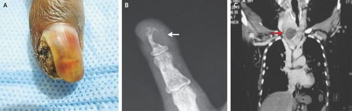 A 50-year-old woman presented with a painless lesion deep in the nail of the left little finger, which she had first noted 2 months earlier. There was no history of associated trauma or pruritus. The physical examination revealed a firm 2-cm lesion with a scab in the center (Panel A). The overlying nail was dystrophic and partially separated from the nail bed. Finger movements were normal. Radiography of the left fifth digit revealed a lytic lesion involving the terminal phalanx (Panel B, arrow). There was also diffuse enlargement of the thyroid gland, with a dominant nodule at the isthmus. Computed tomography of the chest showed an enlarged thyroid with retrosternal extension and a dominant nodule (Panel C, arrow), as well as multiple pulmonary nodules. Fine-needle aspiration of the thyroid nodule revealed a follicular neoplasm, and biopsy of the phalangeal lesion revealed metastasis from follicular thyroid carcinoma. The patient underwent total thyroidectomy. During radioiodine scanning, uptake was noted in the left little finger as well as in the choroid of the eye, thereby highlighting the iodophilic nature of these metastases. After radioiodine therapy, there was complete regression of the digital metastasis.
