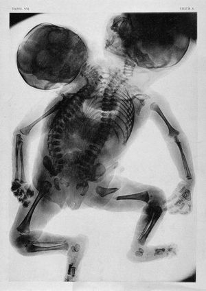 A skeleton of a child born with two backbones and two heads. Collotype by Römmler and Jonas after a radiograph by G. Leopold and Th. Leisewitz, 1908.