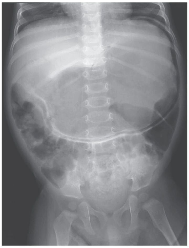 A 10-month-old male infant weighing 7.34 kg (2nd percentile for age and sex) presented with a 4-day history of nonbilious, nonbloody emesis. He had a history of frequent nonbilious emesis and poor weight gain since birth. He had difficulty consuming solid foods and was given a diagnosis of reflux. There was no surgical history. The patient's vital signs were normal, his white-cell count was 12,000 per cubic millimeter, and his abdomen was minimally distended, without tenderness. An abdominal radiograph showed marked gastric emphysema and some gas in the small bowel and colon. Abdominal ultrasonography and computed tomography, performed without the administration of contrast material, confirmed gastric emphysema with no obvious cause. The differential diagnosis included infection, ischemia, and gastric-outlet obstruction due to volvulus, annular pancreas, intestinal malrotation, and duodenal hematoma or stenosis. Laparotomy revealed diffuse gastric and omental emphysema resulting from duodenal stenosis. A duodenoduodenostomy was performed. Within 4 days after surgery, the patient was able to ingest formula and was discharged on day 6. A month later, he was eating age-appropriate foods without emesis.