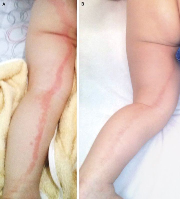 A 19-month-old female infant presented with a 1-week history of ascending linear erythematous eruptions on the left calf. She showed no indications of immune disturbances and was a full-term infant with a healthy rate of weight gain and development. She had been immunized with the varicella vaccine 7 months before presentation. Physical examination revealed a vesicular rash in the S1 dermatome of the left leg (Panel A). A scraping from the base of several vesicles was obtained, and a direct immunofluorescence antigen assay was performed; the results were positive for the varicella–zoster virus. Oral acyclovir was prescribed at a dose of 20 mg per kilogram of body weight per day for 7 days. The lesion improved within a week (Panel B), and there was complete resolution after 2 weeks. Herpes zoster is unusual in persons younger than 10 years of age, and when it does occur in this age group, the lesions have a predilection for dermatomes supplied by the cervical and sacral nerves. In adults, the lesions are more common in the lower thoracic and upper lumbar dermatomes and may involve the trigeminal nerve.