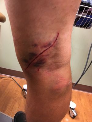 My step father was golfing, and he hit his ball into the woods, keep in mind, the woods were still part of the golf course. When he went to retrieve the ball, the was a line of barbed wire, hidden in the grass. There was no sign, and it was no one's property, but the person who's property is right next to that area did not like people going near their property. So they put up barbed wire. He got caught on the wire and tried to catch himself, only cutting him worse. He went to the doctor and had a diagnoses, but I want to see yours! So what is your diagnoses? I will post the correct answer soon