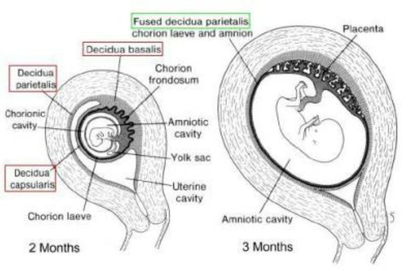 It is functional stratum (sratum compactum)after implantation of blastocyst 1)DECIDUA BASALIS _PART THAT CONTRIBUTES TO MATERNAL COMPONENT OF PLACENTA IT IS FIRMLY ATTACHED TO CHORION 2)DECUDUA CAPSULARIS _PART OF ENDOMETRIUM SURROUNDS EMBRYO LIKE ACAPSULE AND SEPARATES IT FROM UTERINE CAVITY 3)DECIDUA PARIETALIS_PART OF DECIDUA THAT LINES REST OF UTERINE CAVITY FATE OF DECIDUA _as conceptus enlarges decidua capsularis enlarges into uterine cavity and finally fuses with decidua parietalis during 3rd month of pregnancy NOTE_DECIDUA IS NAMED AS SUCH (MEANING_FALLING OFF ) BECAUSE AT END OF PREGNANCY IT IS SHED OFF ALONG WITH PLACENTA AND MEMBRANES