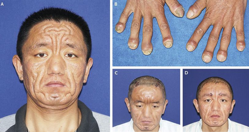 A 32-year-old man of Han Chinese origin presented with a 15-year history of a peculiar facial appearance (Panel A). After puberty, he had noticed a progressive enlargement of his hands and feet as well as facial furrowing. The patient reported that the progression of disease had stabilized by the time he was 27 years of age. On examination, he had excessive sebaceous secretions and thick, furrowed, and redundant skin on his forehead, cheeks, and chin. Soft-tissue hypertrophy reduced the motion of his hands and feet, with terminal broadening of the fingers (Panel B) and toes and cylindrical enlargement of the limbs. The patient received a clinical diagnosis of pachydermoperiostosis, a rare genetic disease characterized by pachyderma, digital clubbing, and periostosis. His parents and son did not have similar symptoms; no genetic testing was performed. The therapy was performed in two stages. In the first stage, we implanted an expander under the patient's forehead skin to enlarge it and to ensure adequate skin tissues (Panel C). Resection of the furrowed and redundant skin was performed in the second stage (Panel D).