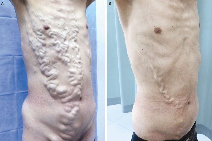 A 57-year-old man with a 5-year history of intermittent edema of the legs was admitted to the hospital because of varices in the right abdominal and chest walls (Panel A). The varices had been gradually increasing in size and number over a period of 18 years. Abnormal results of laboratory tests included a total bilirubin level of 44.0 μmol per liter (2.6 mg per deciliter; normal range, 3.4 to 20.5 μmol per liter [0.2 to 1.2 mg per deciliter]), a serum albumin level of 28.2 g per liter (normal range, 40 to 55), and a prothrombin time of 17.1 seconds (normal range, 9.8 to 12.1). Contrast-enhanced computed tomography of the abdomen revealed a thrombus in suprahepatic and posthepatic portions of the inferior vena cava and multiple varices in the right abdominal wall. No ascites was found. Thrombosis of the inferior vena cava was further confirmed by abdominal ultrasonography and angiography of the inferior vena cava. Thus, a diagnosis of the Budd–Chiari syndrome with thrombosis of the inferior vena cava was made. Subsequent percutaneous recanalization of the inferior vena cava by means of balloon angioplasty and stent placement was successful; after the percutaneous recanalization, the patient received anticoagulation therapy for 6 months and had an excellent clinical response. At the sixth postoperative month, the abdominal-wall varices had improved markedly (Panel B).