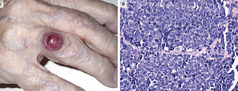 An 84-year-old woman was referred to the dermatology department for evaluation of a rapidly enlarging nodule on her right hand that had developed over 1 month. She reported no trauma to the area and had no systemic symptoms, such as fever, night sweats, and weight loss. Physical examination revealed a painless, red, denuded nodule over the base of the fourth finger (Panel A). No other lesions were identified, and no lymphadenopathy was detected. Analysis of a specimen obtained on punch biopsy revealed nodular infiltration of the dermis (Panel B), and a diagnosis of Merkel-cell carcinoma was made. Merkel-cell carcinoma is an aggressive cutaneous neuroendocrine tumor that is associated with polyomavirus infection, immunosuppression, advanced age, and sun exposure. Patients typically present with enlarging red or pink nodules in sun-exposed areas. The patient underwent amputation of the finger, and because a biopsy specimen obtained from a sentinel lymph node was positive for malignant cells, axillary lymph-node dissection was performed. No evidence of recurrence was found on follow-up at 5 months.