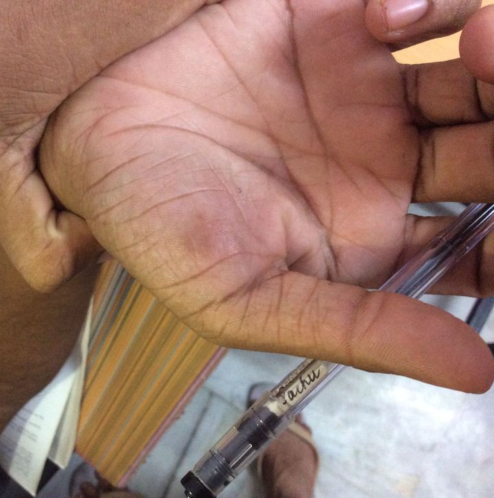 18 yr old boy complaining with this discoloration on his right palm which had appeared suddenly without any known cause and with acute itching at the site for the past 3months .Recently the same has appeared on his left palm with all of the above stated symptoms.....