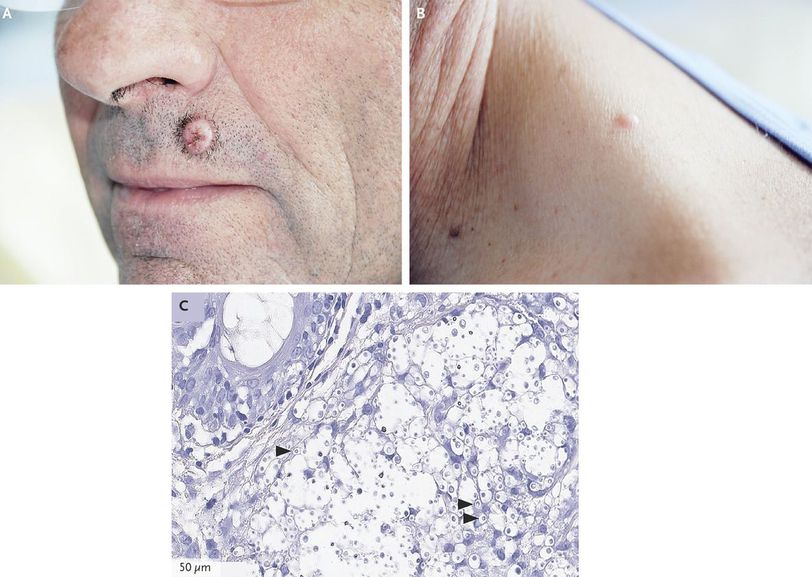 A 60-year-old man presented with a 4-week history of progressive skin lesions. For the past 6 years, he had been treated for chronic lymphocytic leukemia (CLL) with successive administration of a combination of rituximab, fludarabine, and cyclophosphamide, a combination of alemtuzumab and dexamethasone, and a combination of rituximab, bendamustine, and methylprednisolone, to which he had had a partial response. His blood CD4+ T-cell count was 20 per cubic millimeter (1%). The physical examination revealed multiple papules of various sizes that were sometimes umbilicated and were located mainly on his face but also on his shoulders, arms, and legs (Panels A and B). The patient also had polyadenopathy related to the CLL. He was otherwise asymptomatic and, in particular, did not present with fever, a decline in general health, or neurologic signs such as headaches, altered mental status, or neck stiffness. The biopsy of one papule revealed numerous encapsulated yeast forms (Panel C, arrowheads; hematoxylin and eosin). Cryptococcus neoformans was cultured from cerebrospinal fluid, blood, urine, and skin, and a test for serum cryptococcal antigen was positive at a titer of 1:400. Amphotericin B plus flucytosine was administered for 3 weeks before he was transitioned to fluconazole. The skin lesions gradually disappeared, with a decrease in the serum cryptococcal antigen titer.