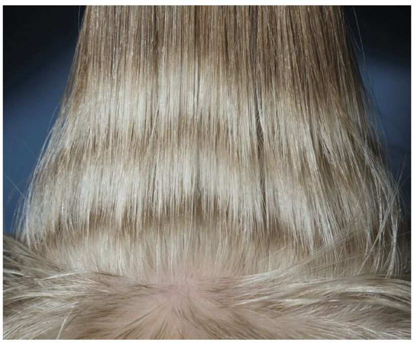 A 37-year-old, red-haired patient presented with strips of red and white hair 4 months after starting treatment with sunitinib for thymic carcinoma as part of an experimental protocol. She had been taking 50 mg of sunitinib daily for 28 days, followed by a 14-day break (the dose approved by the Food and Drug Administration for the treatment of renal-cell carcinoma and gastrointestinal stromal tumors). Sunitinib is an oral small-molecule inhibitor of several receptor tyrosine kinases that affect tumor growth, angiogenesis, and metastasis, including c-KIT. Inhibition of c-KIT signaling reduces hair pigmentation by decreasing melanin synthesis. Changes in both hair and skin pigmentation are recognized effects of treatment with sunitinib. The patient's changes in hair color mirror the pattern of sunitinib ingestion, with white and red bands corresponding to periods of drug ingestion and drug holiday, respectively. She was treated with six cycles of sunitinib, during which the changes in hair color persisted, until disease progression. The patient was doing well clinically and was awaiting her next line of treatment.