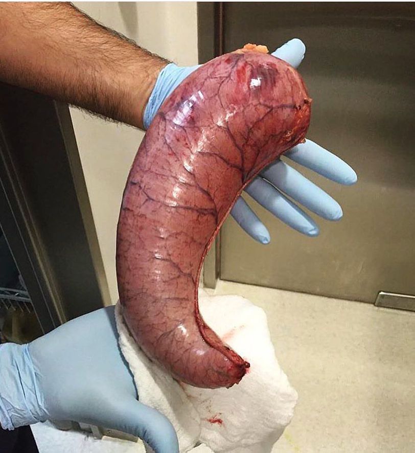 This is the portion of the stomach that was removed during a laparoscopic sleeve gastrectomy, a type of bariatric (surgical weight loss) procedure. Sleeve gastrectomy entails resecting the greater curvature and fundus of the stomach. The partial gastrectomy is oriented vertically, parallel to the lesser curvature of the stomach, which results in a gastric volume reduction of 70 to 80%, leaving a narrow gastric tube or sleeve, with a volume of approximately 150 to 200 mL based on the less distensible lesser curvature. No intestines are removed or bypassed during the sleeve gastrectomy. The main mechanism of action is that it promotes weight loss through two principal mechanisms of action, mechanical (creation of restriction) and endocrine (creation of anorexia): The newly created stomach is considerably smaller and facilitates significantly smaller meals, which translates into less calories consumed. Sleeve gastrectomy removes the gastric fundus and, therefore, significantly decreases the postprandial levels of ghrelin, a hormone referred to as the “hunger hormone” which promotes satiety, suppress hunger. Decreasing the levels of ghrelin promotes weight loss by inducing satiety. Like any surgical operation, sleeve gastrectomy has possible complications, such as leakage, dilation or stricture of the sleeve , gastric dilatation, and gastroesophageal reflux.