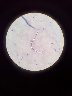 Bancroft’s filaria. A sheathed microfilaria filled with nuclei. However, tail is free of nuclei. Common symptoms are eosinophilia and elephantiasis. Giemsa stained blood films is the method of choice. It is usually transmitted by Cudex, Aedes, and Anopheles vectors. DEC with albendazole and ivermection are used for treatment.
