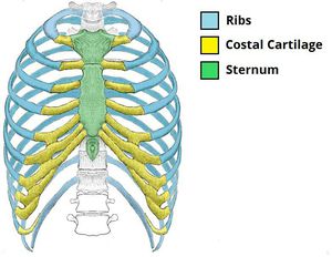 There are usually 12 ribs on each side of the body They are elongated yet flattened bones that curve inferior and anterior from the thoracic vertebrae. The ribs, as well as the costal cartilages, increase in length from the first to the seventh, and their obliquity increases from the first to the ninth. Generally, ribs 1 to 7 are connected to the sternum' by their costal cartilages and are called true ribs, whereas ribs 8 to 12 are termed false ribs. Usually, ribs 8 to 10, by means of their costal cartilages, join the costal cartilage immediately above, whereas ribs 11 and 12, which are free, are known as floating ribs. A supernumerary rib may be found in either the cervical or lumbar region. In thoracic surgery, a portion of a rib can be excised, leaving its periosteum, which later allows regeneration of the bone.