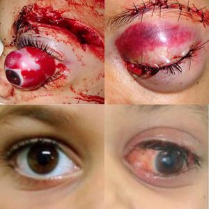 This 5-year-old boy was referred after have been hit by a motorcycle. We observe an intact left eye luxation and an extensive eyebrow laceration. The child didn't presented visual acuit and perception of light. A complete limitation of extra ocular motility in all directions was observed.