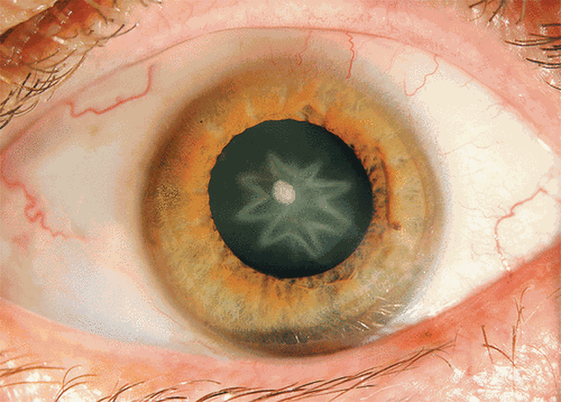 A 55-year-old man was referred by his general practitioner because of a progressive unilateral decrease of visual acuity over the previous 6 months. The patient reported having blunt ocular trauma from a fist punch 9 months earlier. On examination, he was noted to have a stellate-shaped axial opacification of the lens. Traumatic cataracts are caused by blunt or penetrating ocular trauma. The proposed mechanism for indirect injury is shock waves progressing through the eye along the line of concussion. Opacification of the lens may occur in the cortex or capsule and can result in the formation of a stellate-shaped or rosette-shaped cataract. If such injuries disrupt the visual axis, cataract surgery may be required. This patient regained full visual acuity after successful phacoemulsification and intraocular-lens implantation. Claus Zehetner, M.D. Nikolaos Bechrakis, M.D. Innsbruck Medical University, Innsbruck, Austria
