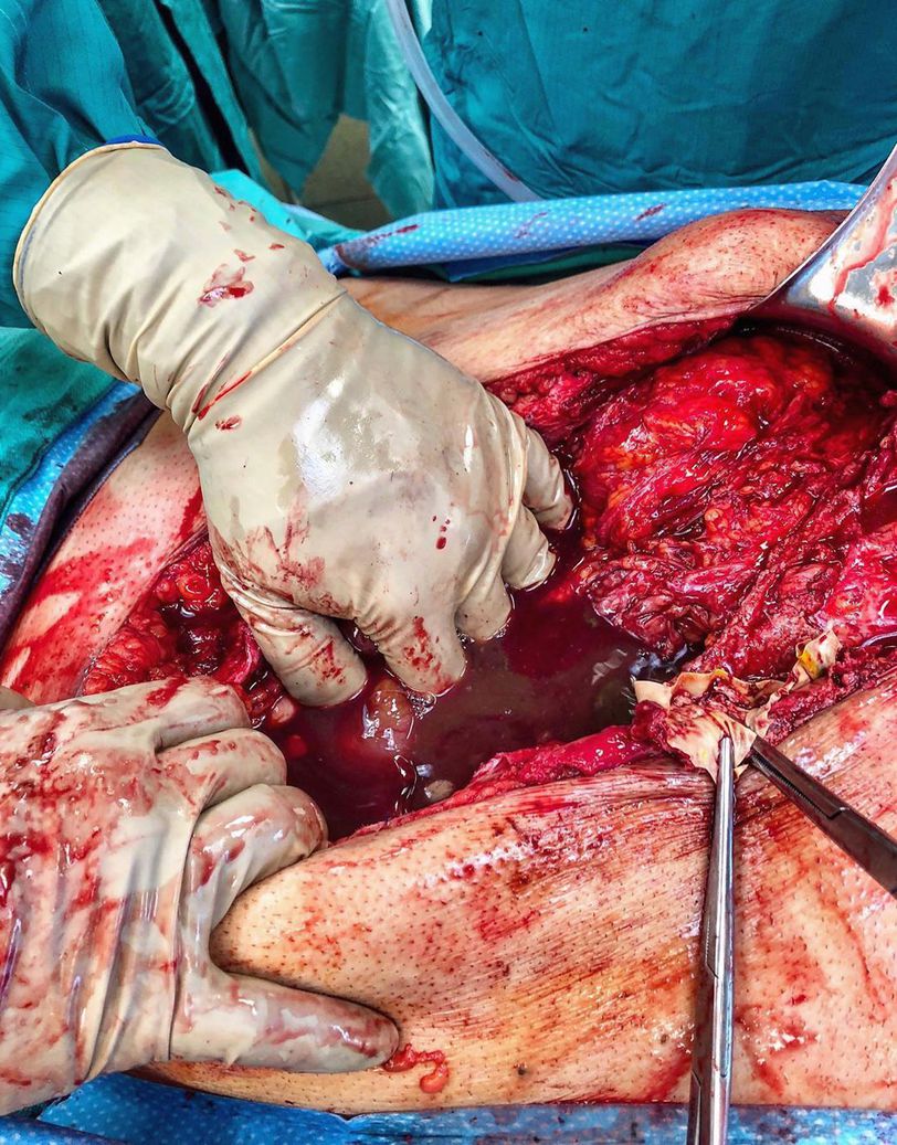 Exploratory laparotomy or EX LAP preformed on a 58 year old male who presented with an infected abdominal mesh from a previous abdominal hernia. Repair performed few years prior with a permanent PLASTIC type mesh (unknown when or where specifically). The mesh contracted and cut the bowel creating a leak of stool into the abdomen which infected the mesh. It healed temporarily, but festered in chronic infection status in the abdomen. The patient presented with progressive abdominal pain and fevers. Extraction of the infected plastic permanent mesh was performed. This is one of the main reasons why we might want to avoid using permanent mesh in an abdominal hernia repair. Preferred are biological meshes which get incorporated within less than a year. These don’t cause problems compared to the permanent plastic mesh type material. Biological mesh are made from human, pigs, or cows (cadaveric dermis).