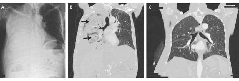 A 67-year-old-man with advanced alcoholic cirrhosis presented with progressive dyspnea. Chest radiography showed findings suggestive of a large right pleural effusion (Panel A). Since hepatic hydrothorax was suspected, thoracentesis was performed, resulting in the aspiration of 1500 ml of transudative fluid. Four hours later, the patient started coughing and had tachypnea and tachycardia, with right lung crackles heard on physical examination. The oxygen saturation was 82% while he was breathing ambient air. Computed tomography (CT) of the chest showed diffuse areas of consolidation and ground-glass opacity in the right lung (Panel B, arrows), suggestive of reexpansion pulmonary edema. After the patient received diuretics and high-flow oxygen through a reservoir mask, there was progressive improvement in his condition. After 4 days, a complete resolution of radiologic findings was seen on CT (Panel C). Reexpansion pulmonary edema can be a complication of thoracentesis. Treatment is largely supportive. Risk factors for this condition include a young age, a long duration of lung collapse, and rapid reexpansion.