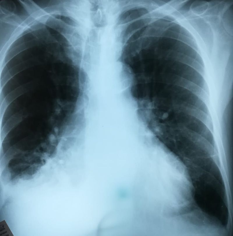 67 Year old male patient, came to the clinic complaining of shortness of breath, orthopnea since 4 days ago, he denies any fever, weight loss or night sweats. his CXR shows obliteration of the right costophrenic angle due to pulmonary effusion. multiple nodules are noted as well. whats your differential diagnosis?