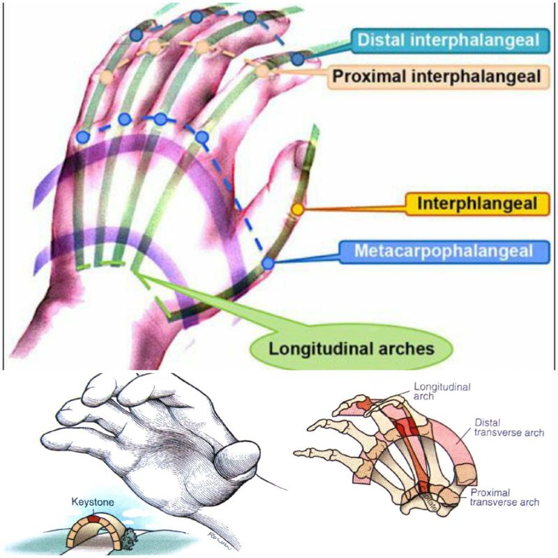 There are arches in hand besides in foot But here they are two transverse and one longitudinal (In foot they are two longitudinal and one transverse)