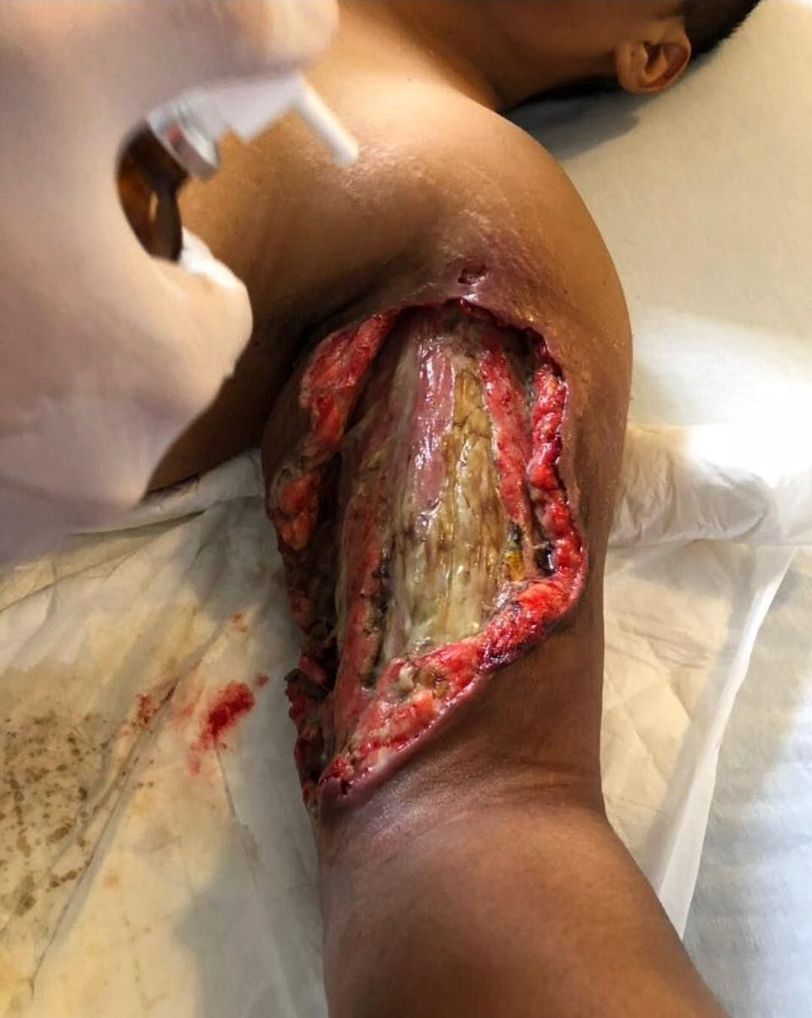 As unbelievable as this might sound, this person got bitten by a spider, but little did he know that it had been a violinist or brown recluse spider, whose venom is known to destroy cartilage, as well as soft tissue and skin. Leaving it untreated, allowed the venom to cause this lesion. This venom contains a rare protein that can cause a lesion, or a much less common, but more dangerous, systemic reaction in humans, depends on the amount of venom injected. Reactions due to brown recluse spider bites are a fever, the chills, itching, going into shock, vomiting; but the most common response is inflammation that after one to two days can develop into a "dark lesion" surrounding the bite site. The blackening, or necrosis, of the skin is dead skin cells, evidence of the immune system's efforts to prevent spread of the toxin by preventing blood flow to the affected area. It can be also dry, blue-gray or blue-white, with an irregular sinking patch with torn edges and extremely swollen and red with the open wound ranging anywhere from a few centimeters to a few inches in size. Photo by @911666ma