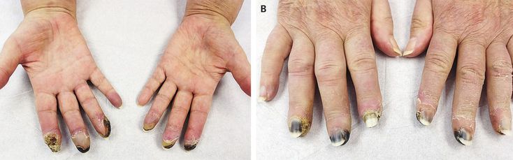 A 69-year-old woman presented with bilateral digital necrosis, which had developed over a period of 2 months (Panels A and B). One year earlier, new-onset Sjögren's syndrome and painful Raynaud's phenomenon had developed. Nifedipine and topical nitroglycerin failed to improve symptoms. The patient did not smoke. Her family history was notable for Waldenström's macroglobulinemia. Laboratory studies were positive for cryoglobulins, and serum protein electrophoresis with the use of immunofixation revealed a monoclonal IgM spike at 345 mg per deciliter with kappa light-chain restriction. Tests for hepatitis C virus, serum viscosity, and lymphocyte counts were normal. The patient received a diagnosis of cryoglobulinemia with an IgM monoclonal gammopathy of unknown significance. To treat the cryoglobulinemia, two courses of chemotherapy with dexamethasone, cyclophosphamide, and rituximab were administered over a period of 2 weeks. After 1 month without clinical improvement, video-assisted thoracic sympathectomy was performed to increase perfusion. After the sympathectomy, the patient's hands became warm and moist. One year after presentation, cryoglobulins were undetectable, the patient's fingers had gradually improved, and there had been no amputations.