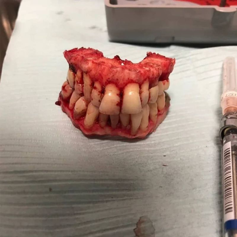 This patient had severe periodontal (gum) disease which results in bone loss around the teeth, which causes tooth mobility. Once this condition reaches this point, the teeth are hopeless, and removal is necessary. The reason the bone was removed in addition to the teeth was for adequate bone availability for the implants and adequate inter-arch space (space between the top and bottom jaws) for an appropriate prosthesis. In this case, it will be a hybrid denture - secured by implants. This is often called an "all-on-four". . Periodontal disease, also known as gum disease, is a set of inflammatory conditions affecting the tissues surrounding the teeth. In its early stage, called gingivitis, the gums become swollen, red, and may bleed. In its more serious form, called periodontitis, the gums can pull away from the tooth, bone can be lost, and the teeth may loosen or fall out. Credit: StafneDefect Tag a friend and follow us @Medicalpedia for more!