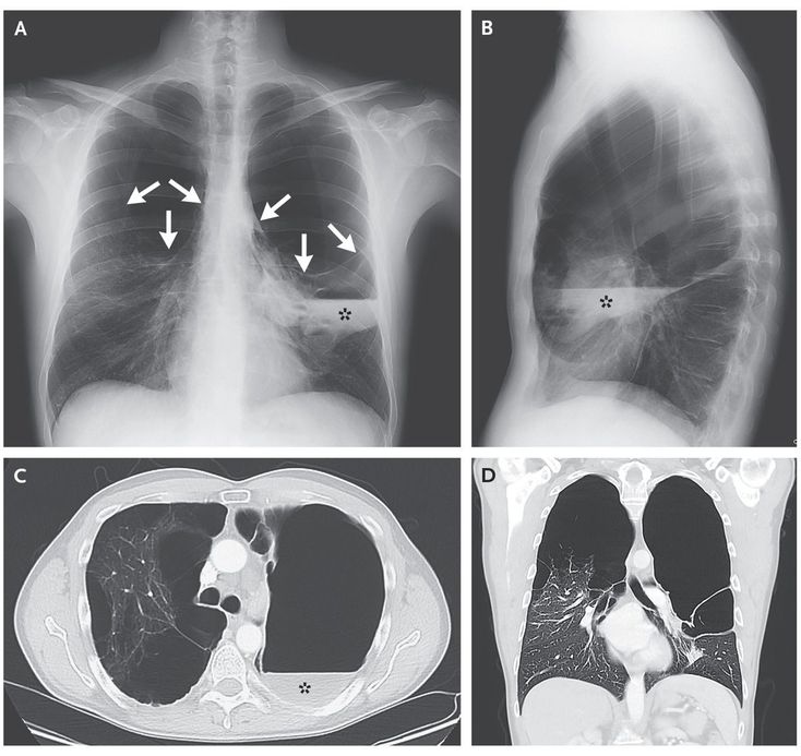 A 41-year-old man with a smoking history of 30 pack-years presented with chronic chest pain, dyspnea, and cough. His vital signs were normal, and laboratory studies were unremarkable, including his level of α1-antitrypsin, which was normal. Physical examination revealed cachexia, with decreased apical breath sounds and hyperresonance to percussion in both lungs. Chest radiography showed extensive bullous lung disease in the apex and upper lobes of both lungs (Panel A, arrows; Panel B), which was suggestive of vanishing lung syndrome; air–liquid levels were seen in the left lung (Panels A, B, and C, asterisk). Computed tomography of the chest confirmed these findings (Panels C and D). Vanishing lung syndrome, otherwise known as idiopathic giant bullous emphysema, typically occurs in young, thin male smokers. The radiographic criteria for vanishing lung syndrome were proposed in 1987, and they include giant bullae in one or both upper lobes occupying at least one third of the hemithorax and compressing surrounding parenchyma. Air–liquid levels within bullae are uncommon and raise the question of bacterial superinfection. Lung-volume–reduction surgery is considered for selected patients with vanishing lung syndrome after assessment of exercise capacity, pulmonary-function testing, and smoking cessation. This patient underwent successful lung-volume–reduction surgery and is currently without residual symptoms.