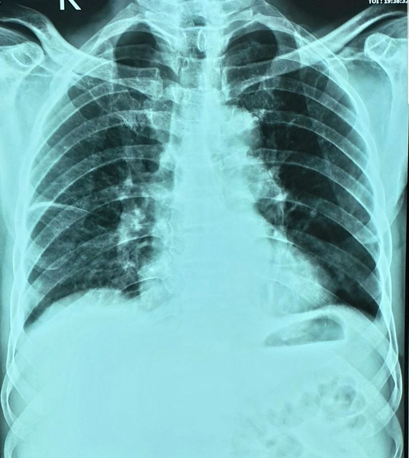 It si not a really good X ray because it si overexpoused and rotated to the left side. But it seems to be some kind of liquid collection no the right cisure. Also the nodes on the right hillium are big. Could be cancer??
