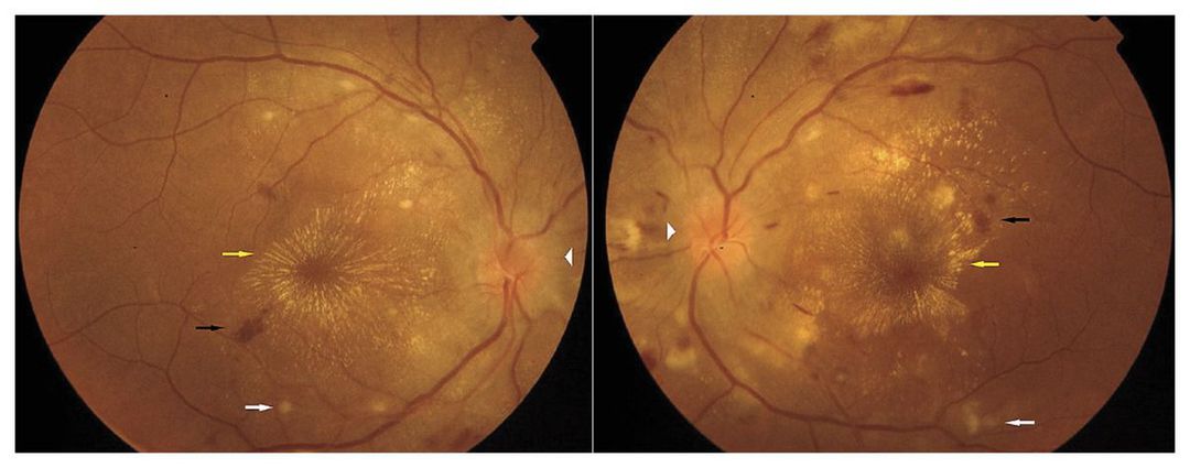 A 25-year-old primigravida at 36 weeks of gestation presented with a 2-week history of headache, light flashes, and blurred vision in both eyes. Her corrected visual acuity was 20/40 in the right eye and 20/50 in the left eye. Funduscopic examination revealed bilateral grade 4 hypertensive retinopathy, with widespread hemorrhages (black arrows), cotton-wool spots (white arrows), hard exudates in a star shape (yellow arrows) in the macular region, and swelling of the optic disks (arrowheads). Physical examination revealed a blood pressure of 220/140 mm Hg and pedal edema. A 24-hour urine specimen showed proteinuria (protein, 7.4 g). Severe preeclampsia was diagnosed. The patient was referred to the obstetrical department and, after initial stabilization, underwent prompt cesarean delivery, which resulted in the birth of a low-birth-weight boy (1900 g); the 1-minute and 5-minute Apgar scores were 8 and 9, respectively. Three months later, the exudates had spontaneously resolved, and the patient slowly regained visual acuity of 20/25 in both eyes.