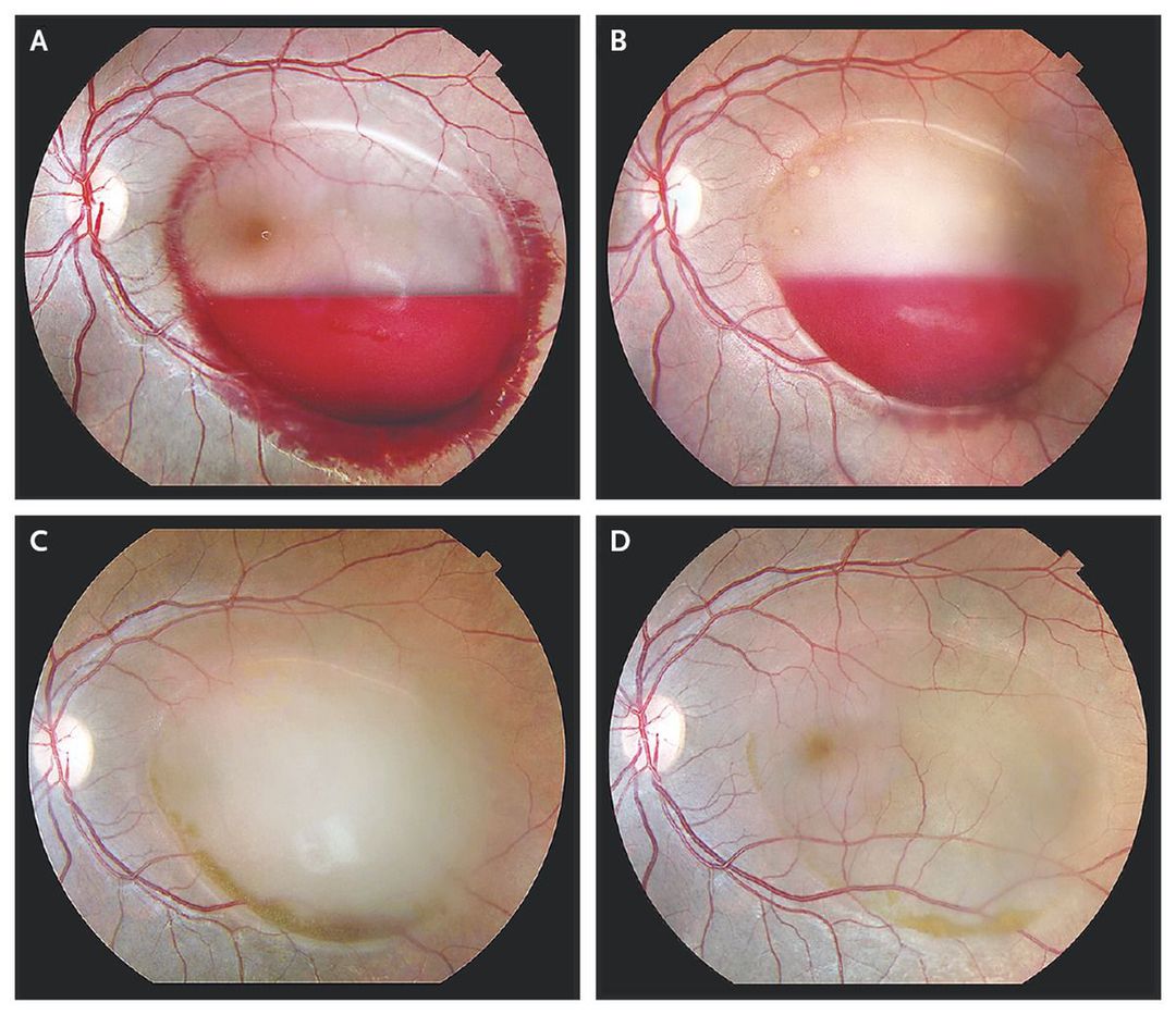 A 25-year-old woman at 11 weeks of gestation presented with sudden, painless, central “dark” vision after an episode of forceful vomiting (“morning sickness,” or emesis gravidarum). Visual acuity was 20/80 in the left eye. Funduscopy revealed sedimented preretinal hemorrhage that was enclosed by a dome-shaped preretinal membrane, features consistent with Valsalva retinopathy (Panel A). Examination of the right eye was normal, as were the blood pressure, complete blood count, prothrombin time, activated partial-thromboplastin time, and fasting blood glucose level. Improvement was seen at 2 weeks (Panel B), 2 months (Panel C), and 5 months (Panel D) after presentation, and the hemorrhage finally resolved. Visual acuity in the left eye improved to 20/25. Typically self-limiting, Valsalva retinopathy is caused by retinal capillary rupture after abrupt rises in intraocular venous pressure, which may occur with violent coughing or vomiting. The dome-shaped area can represent the posterior hyaloid or internal limiting membrane, or both. These preretinal structures are closely apposed to the retinal surface in young adults, although hemorrhage can dissect tissue planes and fill the potential spaces. Pathological analysis of the preretinal membrane after surgery is necessary to unambiguously identify it as the posterior hyaloid or internal limiting membrane and to determine whether the hemorrhage is subhyaloid or beneath the internal limiting membrane. Subhyaloid and internal-limiting-membrane hemorrhages can also occur with hematologic dyscrasias and cancers, hypertension, the rupture of a retinal macroaneurysm, subarachnoid hemorrhage, and the shaken-baby syndrome. Treatment options are laser membranotomy, vitrectomy, or as in this patient, observation.