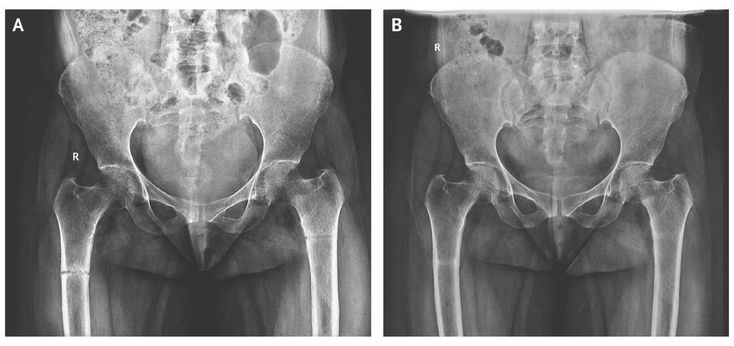 A 45-year-old woman presented with a 3-month history of generalized body pains that were nonresponsive to analgesic agents. Along with low back pain, she had progressive difficulty in getting up from sitting and supine positions and in walking. There was no history of trauma or any medication intake. She is an orthodox Muslim woman who wears a black veil outdoors and is completely covered, with little exposure to the sun, even in her courtyard. On examination, she had a waddling gait with painful movements of both thighs. The serum calcium level was 8.4 mg per deciliter (2.1 mmol per liter) (reference range, 8.0 to 10.4 mg per deciliter [2.0 to 2.6 mmol per liter]), the phosphate level 1.5 mg per deciliter (0.5 mmol per liter) (reference range, 2.5 to 4.5 mg per deciliter [0.8 to 1.5 mmol per liter]), the alkaline phosphatase level 916 U per liter (reference range, 30 to 120), and the 25-hydroxyvitamin D level 9 nmol per liter (reference range, 18 to 100). An anteroposterior radiograph of the pelvis showed an undisplaced transverse fracture of the shaft of both femurs (Panel A). The patient was treated with therapeutic doses of calcium and vitamin D supplements. After 3 weeks, her symptoms had improved substantially, and she walked with minimal pain. Blood tests showed an increase in the phosphate level to 3.0 mg per deciliter (1.0 mmol per liter) and a decrease in the alkaline phosphatase level to 418 U per liter. A follow-up radiograph showed healed fractures (Panel B). Patients with osteomalacia may present with generalized osteopenia. A radiographic study may show cortical stress fractures, often called Looser zones or pseudofractures, which are seen as bilateral, symmetric, radiolucent lines in the bone cortex perpendicular to the long axis. Looser zones contain fibrous tissue and poorly mineralized callus and are often found on the ribs, the femoral neck, the pubic rami, and the axillary margins of the scapulae.