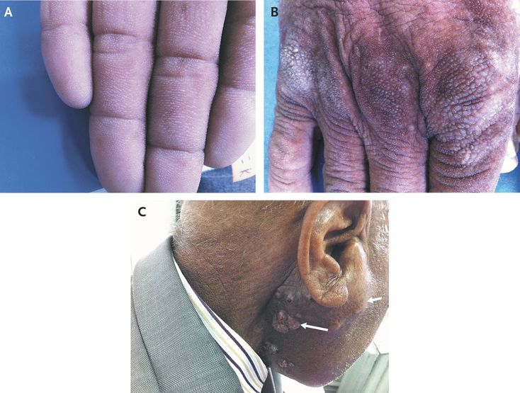 A 67-year-old man presented with a 2-month history of widespread thickening of his skin and a 2-week history of multiple cutaneous nodules in the right infraauricular region. He had a history of squamous-cell carcinoma of the tongue base. Examination of the palmar side of his hands revealed velvety, thickened ridges resembling tripe (Panel A). Hyperpigmentation and accentuation of skin markings were noted at multiple locations, including the joints of his hands (Panel B), suggesting acanthosis nigricans. A 4-cm subcutaneous nodule (Panel C, short arrow) and approximately 10 skin-colored papules (Panel C, long arrow) were noted in the right preauricular and infraauricular regions, respectively. Biopsy of the palmar skin revealed acanthosis palmaris, and biopsy of the skin-colored papules revealed cutaneous metastases of squamous-cell carcinoma. Acanthosis palmaris (also known as tripe palms or acquired pachydermatoglyphia) is typically manifested as velvety, diffuse palmar hyperkeratosis and accentuated dermatoglyphic patterns and is usually associated with cancer, most often gastric or lung cancer. Because the patient was under an oncologist's care and declined topical treatment, we did not start additional therapy.