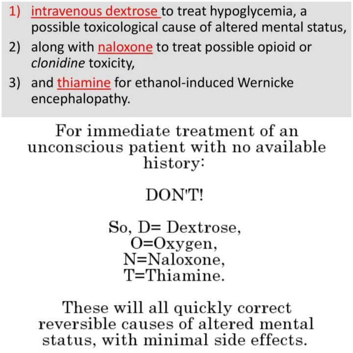 For immediate treatment of an unconscious person with no available chance of the cause /history for it...