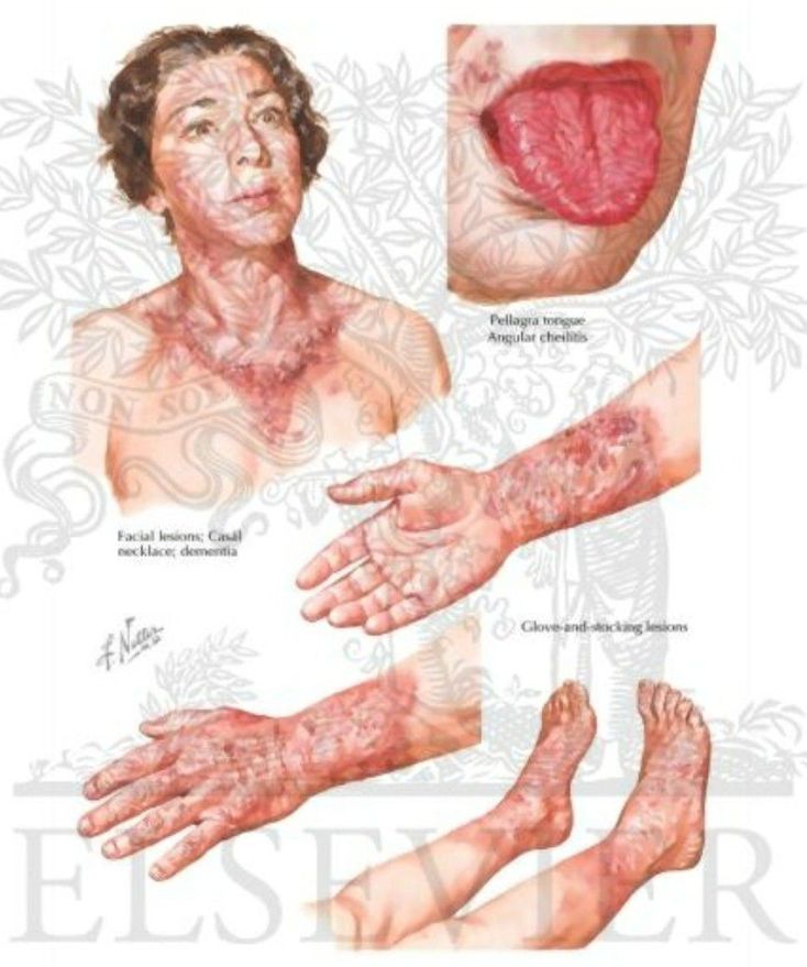FOUR D'S Dermatitis (castle's necklace may be seen) Diarrhea Dementia