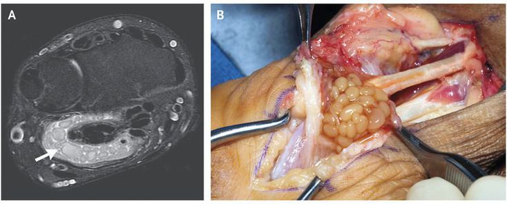 A 51-year-old right-handed man presented to the clinic with a 3-year history of worsening swelling of the left wrist associated with pain and numbness in the fingers. His medical history included type 2 diabetes and human immunodeficiency virus infection; he was adherent to an antiretroviral therapy regimen and his CD4 cell count was 357 per cubic millimeter. He reported no previous trauma or surgeries to the hand. Physical examination was notable for purplish discoloration over the palmar aspect of the left hand. He had pain and an extension deficit in the proximal interphalangeal joint in all four fingers. Magnetic resonance imaging (MRI) revealed multiple loose bodies (“rice bodies”) in an ulnar bursal fluid collection on the volar side of the left wrist (Panel A, arrow). The patient underwent a radical tenosynovectomy, during which soft-tissue masses corresponding to the rice bodies identified on MRI were seen (Panel B). These soft-tissue masses are accumulations of fibrin, collagen, and cell debris resulting from synovial degeneration. Histologic analysis revealed granulomatous tenosynovitis, and mycobacterial culture confirmed invasive mycobacterial tenosynovitis due to Mycobacterium avium complex. The patient was treated with rifabutin, ethambutol, and clarithromycin; the medication regimen was discontinued after 3 months because of side effects. There was no evidence of recurrence at 5-year follow-up