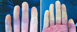 A 26-year-old woman presented with pain and discoloration in the fingertips of both hands on exposure to cold (Panels A and B). She had had the same symptoms every winter for the past decade. The patient's history and physical examination revealed no signs or symptoms suggestive of systemic lupus erythematosus or scleroderma. She reported that she did not smoke. Her history of a sudden onset of the symptoms is consistent with a diagnosis of Raynaud's phenomenon. Raynaud's phenomenon is characterized by exaggerated vasoconstrictive color changes (pallor and cyanosis) in the fingers, usually due to exposure to cold. The phenomenon is considered primary if there is no evidence of an underlying medical illness. Secondary Raynaud's phenomenon occurs in association with another condition, such as systemic lupus erythematosus, scleroderma, or peripheral vascular disease. The patient was given a recommendation to keep her hands warm to avoid further attacks. Although pharmacologic treatments such as calcium-channel blockers, topical nitroglycerin, sildenafil, and other vasodilators may play a part in the management of Raynaud's phenomenon, this patient did not require any medications for the management of her attacks. Michael Rodgers, M.D. University Medical Center Groningen, Groningen, the Netherlands
