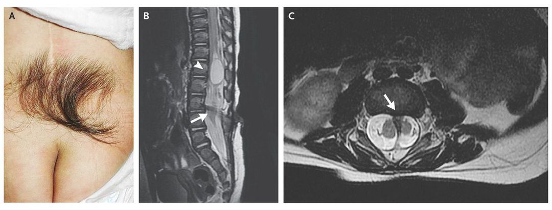 A 3-year-old girl was referred for the removal of excess hair on the back, which had been present since birth, for cosmetic reasons. The physical examination revealed a tuft of coarse, dark hair in the midline of the back just above the natal cleft (Panel A). Her history revealed leakage of clear fluid from the hypertrichotic region since birth. At that time, magnetic resonance imaging had shown syringomyelia at L1 (Panel B, arrowhead), diastematomyelia with bony spurs at L3 and L4 (Panel C, arrow), and tethered cord and low-lying conus medullaris at L5 (Panel B, arrow). At the age of 4 days, the patient had undergone repair of leakage of cerebrospinal fluid, and at 7 months of age, she had undergone drainage of the syrinx, release of tethered cord, and removal of bony spurs to repair the diastematomyelia. In the 3-year follow-up after surgery, the patient had had no leakage of cerebrospinal fluid, no urinary or stool incontinence, no difficulty in walking, and no developmental delay. The histopathological examination of a specimen of cerebrospinal fluid that had been obtained during the first surgery was compatible with meningocele. A patch of hair in the lower back may be a cutaneous marker of spinal dysraphism and should prompt consideration of underlying spinal abnormalities to prevent neurologic sequelae. The parents were informed about the laser technique for removing excess hair when the child is old enough to cooperate with the procedure.