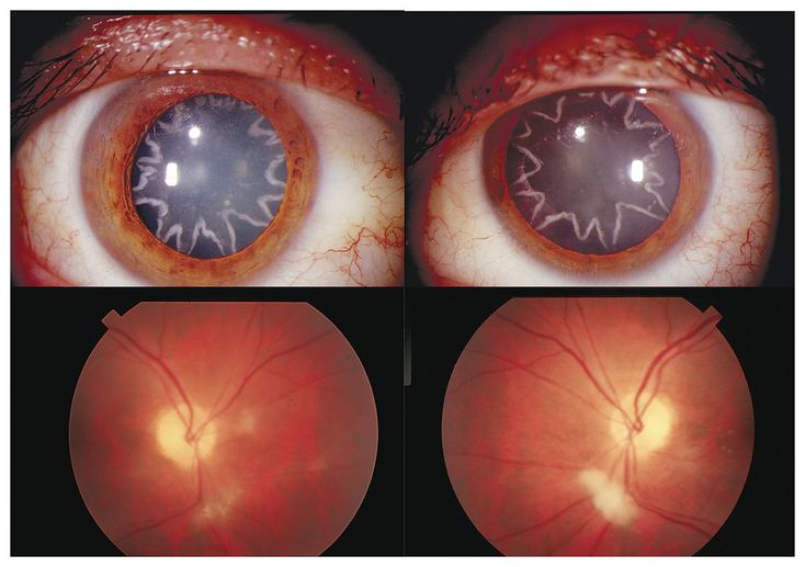 A 42-year-old male electrician presented to the eye clinic with decreasing vision 4 weeks after an electrical burn of 14,000 V to the left shoulder. His vision in both eyes was limited to perception of hand motions, with an intraocular pressure of 14 mm Hg in each eye. Slit-lamp examination showed bilateral stellate anterior subcapsular opacities of the lens (top panels, right and left). Dilated funduscopic examination showed scattered cotton-wool spots and bilateral optic-nerve pallor, which was greatest in the left eye (bottom panels, right and left). Four months after the injury, the patient underwent cataract extraction and implantation of an intraocular lens, which was followed by improvement in visual acuity to 20/70 in the right eye and 20/400 in the left eye. Two years after the injury, a retinal detachment developed in the left eye, and the patient underwent repair. At a 10-year follow-up visit, the patient's visual acuity was 20/100 in the right eye, but in the left eye he could only count fingers. There was bilateral optic atrophy with widespread macular pigment disruption. Although the patient was legally blind, he was able to read with the use of low-vision aids and was able to independently commute on public transportation. When lenticular opacities are the sole manifestations of electrical injury, cataract extraction is expected to produce a functional outcome. However, with concurrent damage to the optic nerve and retina, complete visual rehabilitation may be limited.