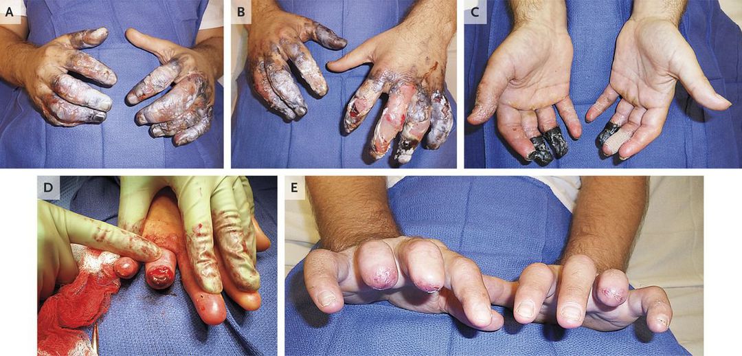 A 42-year-old man presented for outpatient follow-up 6 days after being released from the hospital, where he had been admitted 9 days earlier for digital frostbite, hypothermia, and rhabdomyolysis. Before admission, he had gone on a winter hike alone and was caught in an unexpected snowstorm that obscured visibility. He became disoriented, lost sight of the trail, and fell into icy water, after which his hands became frozen in his gloves. After 36 hours of outdoor exposure to freezing conditions, he was rescued and admitted to the local hospital, where he was treated with a hyperthermic bath, warm intravenous fluids, topical silver sulfadiazine, and physical therapy and was discharged home after 3 days. At follow-up, examination of his hands revealed edema, purple discoloration, and sloughing of the skin on all digits except his left thumb (Panel A). Serial débridements were performed and stellate ganglion blocks were administered on an outpatient basis. The appearance of his fingers and right thumb improved over the next month (Panel B). Demarcation of necrotic, mummified tissue on the distal left ring finger and right middle and ring fingers was noted 2 months after the initial injury (Panel C). Amputation of the affected areas was subsequently performed; intraoperative findings included nonbleeding, necrotic bone (Panel D). Postoperative healing was uneventful (Panel E).