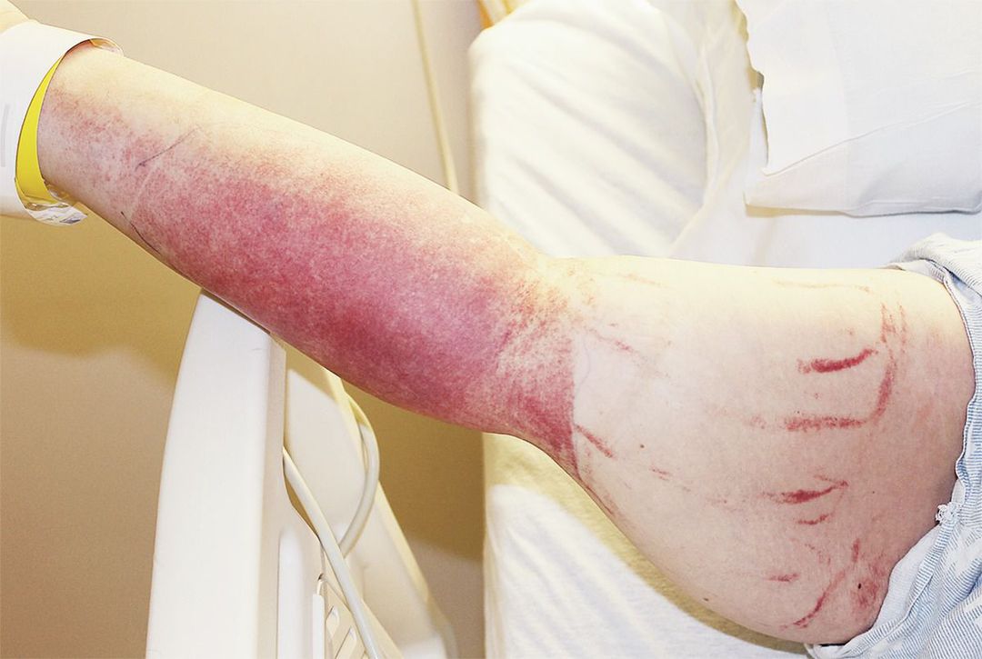 A 47-year-old woman with a history of abdominal surgery presented with syncope and acute gastrointestinal bleeding. She went to the hospital, and while she was undergoing continuous blood-pressure monitoring, a petechial rash with a well-demarcated upper margin was noted on each arm distal to the sphygmomanometer cuff. Continuous blood-pressure monitoring was immediately stopped, and after a period of 6 days, the rashes had resolved. The formation of petechiae distal to a tourniquet or sphygmomanometer on release of pressure is known as the Rumpel–Leede sign. This sign was reported in 1909 by Theodor Rumpel, and again independently in 1911 by Carl Stockbridge Leede. While treating patients with scarlet fever, they both noted petechiae on the arms of patients distal to the part of the arm where a tourniquet had been applied. Historically, the tourniquet test (or Rumpel–Leede Capillary-Fragility Test) was used to assess patients for thrombocytopenia and capillary fragility. Today, the Rumpel–Leede sign may be observed iatrogenically in the context of continuous blood-pressure monitoring, particularly in patients with bleeding diatheses. In this patient, the Rumpel–Leede sign was attributed to continuous monitoring with the use of sphygmomanometer cuffs that were too small, rather than to coagulopathy.