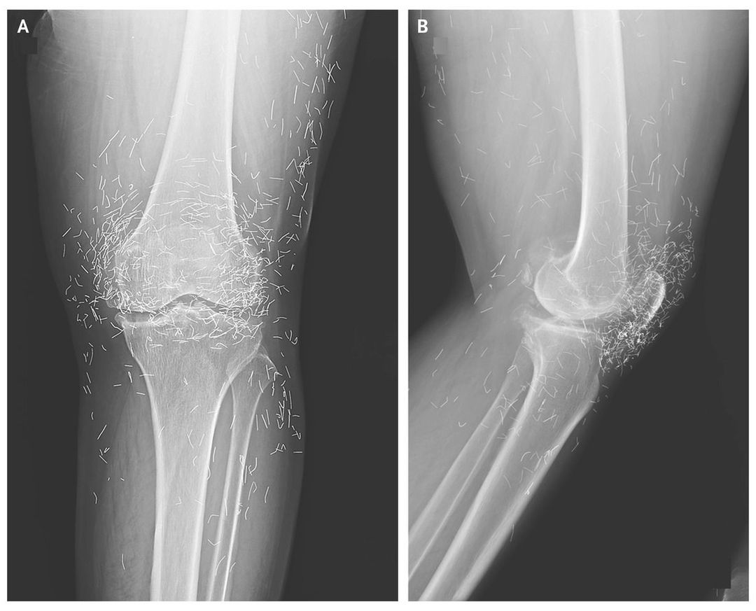 A 65-year-old woman presented with pain in both knees. She had received a diagnosis of osteoarthritis of the knee previously and had been treated with analgesic agents and nonsteroidal antiinflammatory drugs. In addition, she was treated intermittently with intraarticular injection of a glucocorticoid. In spite of these therapies, the arthralgia in the knees did not abate. Gastrointestinal discomfort caused by the medications necessitated their discontinuation. Therefore, she underwent acupuncture with gold threads as an adjunctive therapy once per week and more frequently when severe pain was present. Radiography of the left knee revealed moderate subchondral sclerosis of the medial portion of the tibia, osteophytosis of the medial portions of the tibia and femur with possible narrowing of the joint space, and numerous radiodense threads around the left knee joint (Panel A shows the anteroposterior view, and Panel B the lateral view). Complementary medicine and alternative medicine are often pursued in the treatment of osteoarthritis. Acupuncture is widely used as a treatment for painful joints. It has been hypothesized that gold thread implanted at the acupuncture points acts as a continuous acupuncture stimulation. The insertion of small pieces of sterile gold thread around the joint by means of acupuncture needles has been used commonly in the treatment of osteoarthritis and rheumatoid arthritis in Asian countries. Gold threads may complicate radiographic assessment, as seen here.