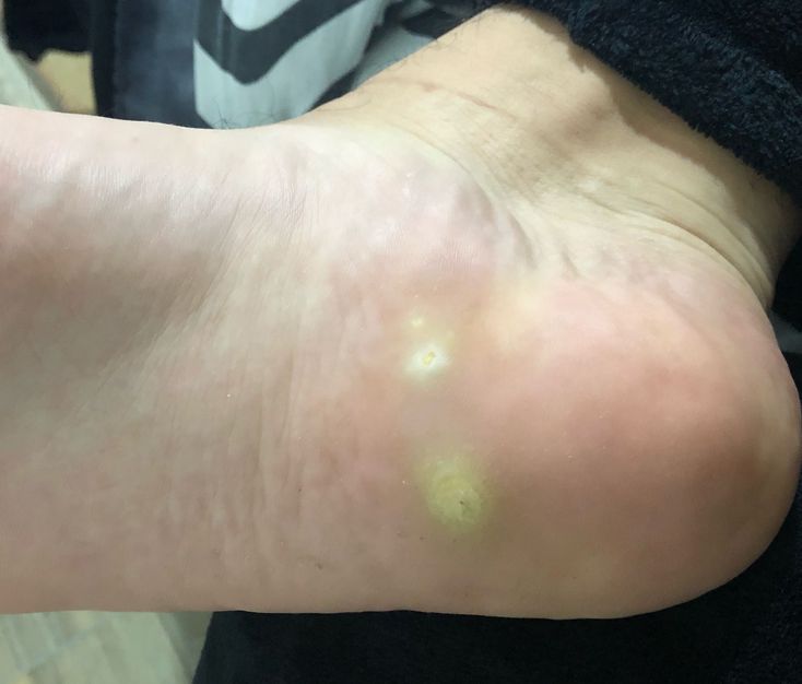 I'm inclined to say callus buildup on a plantar wort(s). ETA: Had a very similar case to the lower callus/wart. Moderate pain when walking but worsened with manual pressure. I shaved the callus as much as possible then applied wart treatment kit. Completely gone in 2 weeks.