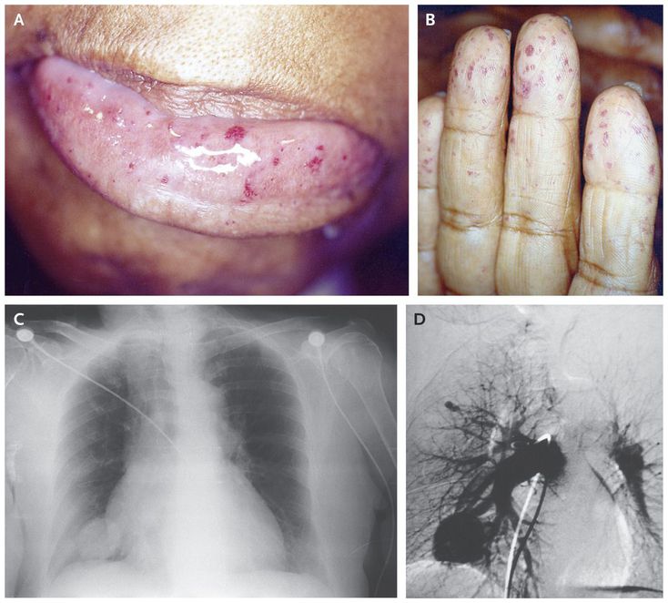 A 74-year-old woman was hospitalized with sudden-onset weakness on the left side due to an acute infarct of the right middle cerebral artery. Her medical history was notable for intermittent epistaxis, melena, and chronic anemia. The family history included multiple first-degree relatives who had similar symptoms. In addition to a flattened nasolabial fold, hemiparesis, and hyperreflexia on the left side, telangiectasias on the oral mucosa and fingers were found on physical examination (Panels A and B). A chest radiograph showed a round density in the right hemithorax (Panel C), which angiography confirmed to be a large pulmonary arteriovenous malformation (Panel D). Hereditary hemorrhagic telangiectasia (or Rendu–Osler–Weber syndrome) is an autosomal dominant disorder leading to vascular malformations. A clinical diagnosis is made in the presence of any three of the following: recurrent epistaxis, mucocutaneous telangiectasias, visceral arteriovenous lesions, or a first-degree relative with hereditary hemorrhagic telangiectasia. Pulmonary arteriovenous malformations can lead to stroke due to paradoxical embolism. The patient underwent successful coil embolization of the arteriovenous malformation to prevent future ischemic events but was subsequently lost to follow-up.