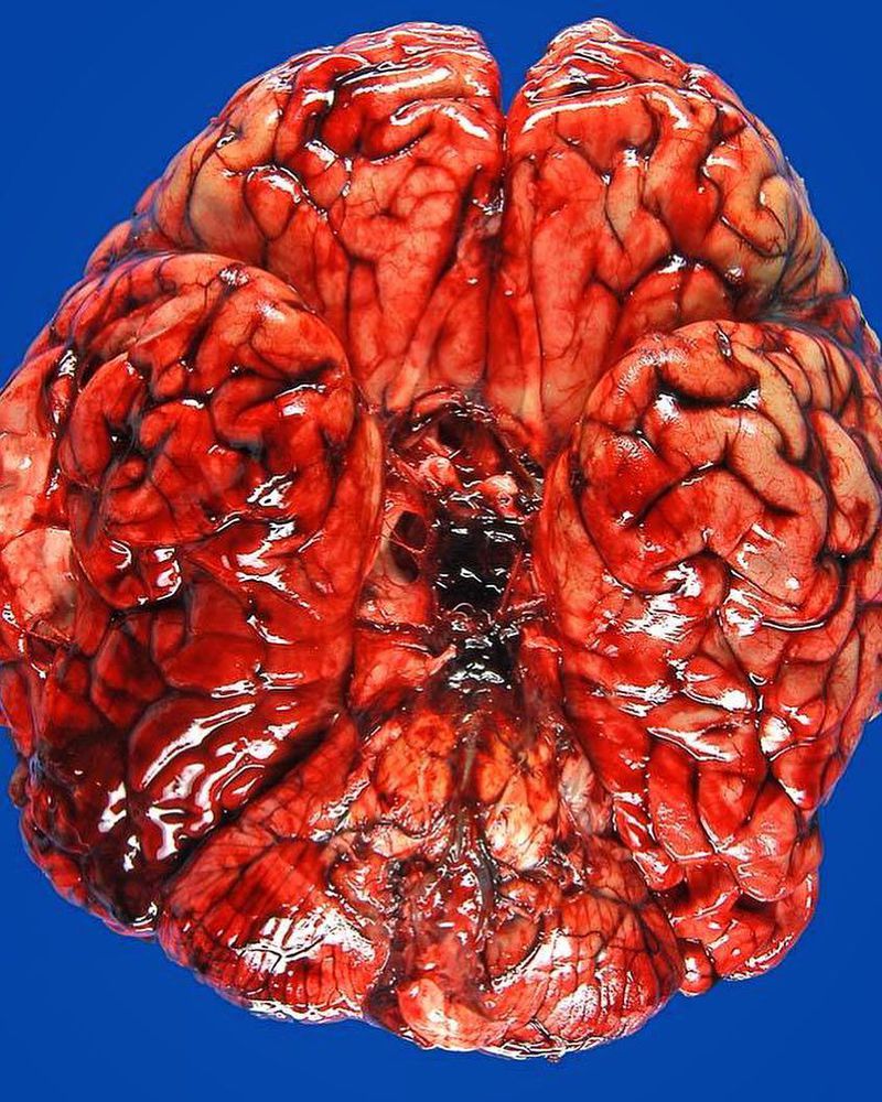 Notice the dark hematoma at the center at this brain autopsy. This happened due to extravasation of blood into the subarachnoid space between the pial and arachnoid membranes surrounding the entire brain. It occurs in various clinical contexts, the most common being head trauma. However, the familiar use of the term subarachnoid hemorrhage refers to nontraumatic (or spontaneous) hemorrhage, which usually occurs in the setting of a ruptured cerebral aneurysm (weaknesses in the wall of the arteries of the brain that enlarge and its rupture leads to severe bleeding) or arteriovenous malformation. The classic symptom is thunderclap headache ("most severe ever" headache developing over seconds to minutes), and is often described like being "kicked in the head". Other symptoms may be vomiting, seizures, photophobia, loss of consciousness and meningism, but these are significantly less common and non-specific. Due to its acute onset, it is a medical emergency which can lead to death or severe disability even if recognized and treated in an early stage. Surgical treatment to prevent rebleeding includes clipping the ruptured aneurysm or endovascular treatment (ie, coiling).