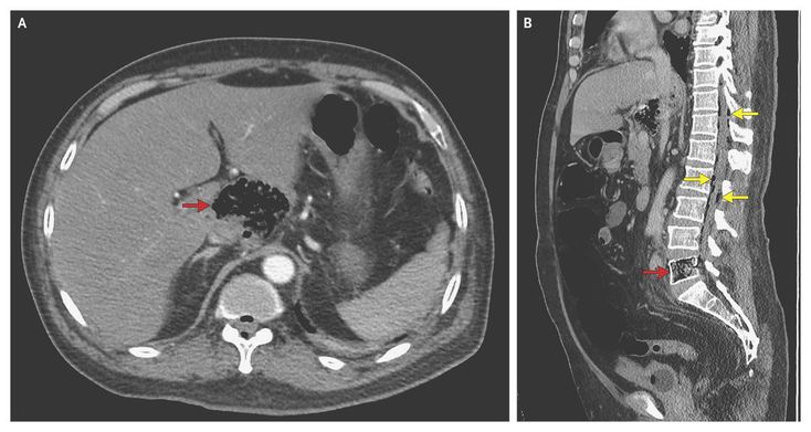A 60-year-old man of Burmese origin presented to the emergency department with severe back pain that had lasted 1 week. He had a fever (39.8°C) and hyperglycemia but had not received a diagnosis of diabetes previously. He had not traveled to Myanmar (Burma) or been in contact with anyone from Myanmar during the previous 2.5 years. Encephalopathy and multiple organ failure rapidly developed. Computed tomography of the abdomen revealed a gas-forming infection in the caudate lobe of the liver (Panel A, arrow) and the fifth lumbar vertebral body (Panel B, red arrow). Gas extended posteriorly into the epidural space (Panel B, yellow arrows), as well as anterolaterally, particularly along the margin of the right psoas muscle. An abscess in the lower lobe of the right lung was also noted. Cultures of bronchoalveolar-lavage fluid, blood, and material from percutaneous drainage of the liver abscess all grew Klebsiella pneumoniae. The syndrome of primary liver abscess caused by K. pneumoniae infection with septicemia is well recognized, particularly in Taiwan and Southeast Asia. It can be associated with gas formation and metastatic infection. This patient was treated with antibiotic agents and recovered, although damage to his fifth lumbar vertebra had occurred, resulting in chronic back pain.