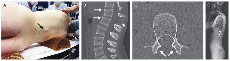 A 14-year-old girl presented to the emergency department after a car accident; she had been wearing a lap–shoulder seat belt. She had severe back pain but had normal strength and sensation of touch in her legs; she reported no paresthesias. Palpation of the lumbar spine revealed prominence of the spinous process of the first lumbar vertebra (Panel A, arrow) and an increased gap between the first and second lumbar spinous processes, findings that aroused suspicion of a flexion–distraction injury. Computed tomography revealed disruption of the ligaments in the posterior column (Panel B, arrowhead) and the middle column, as well as disruption of the L1–L2 intervertebral disk in the anterior column. There were also fractures of the anterosuperior aspects of L1 and L2 (Panel B, arrows) and dislocation of the L1–L2 facet joints (Panel C, arrows; the inferior articulating facets of L1 are absent). These fractures are characterized by violent flexion, with all elements posterior to the axis of rotation submitted to distraction forces; the fractures are unstable and require surgical treatment. The patient underwent T12–L2 fusion (Panel D) and was pain-free 4 months after surgery. She was authorized to return to swimming 4 months after surgery and to all sports activities 2 months later.
